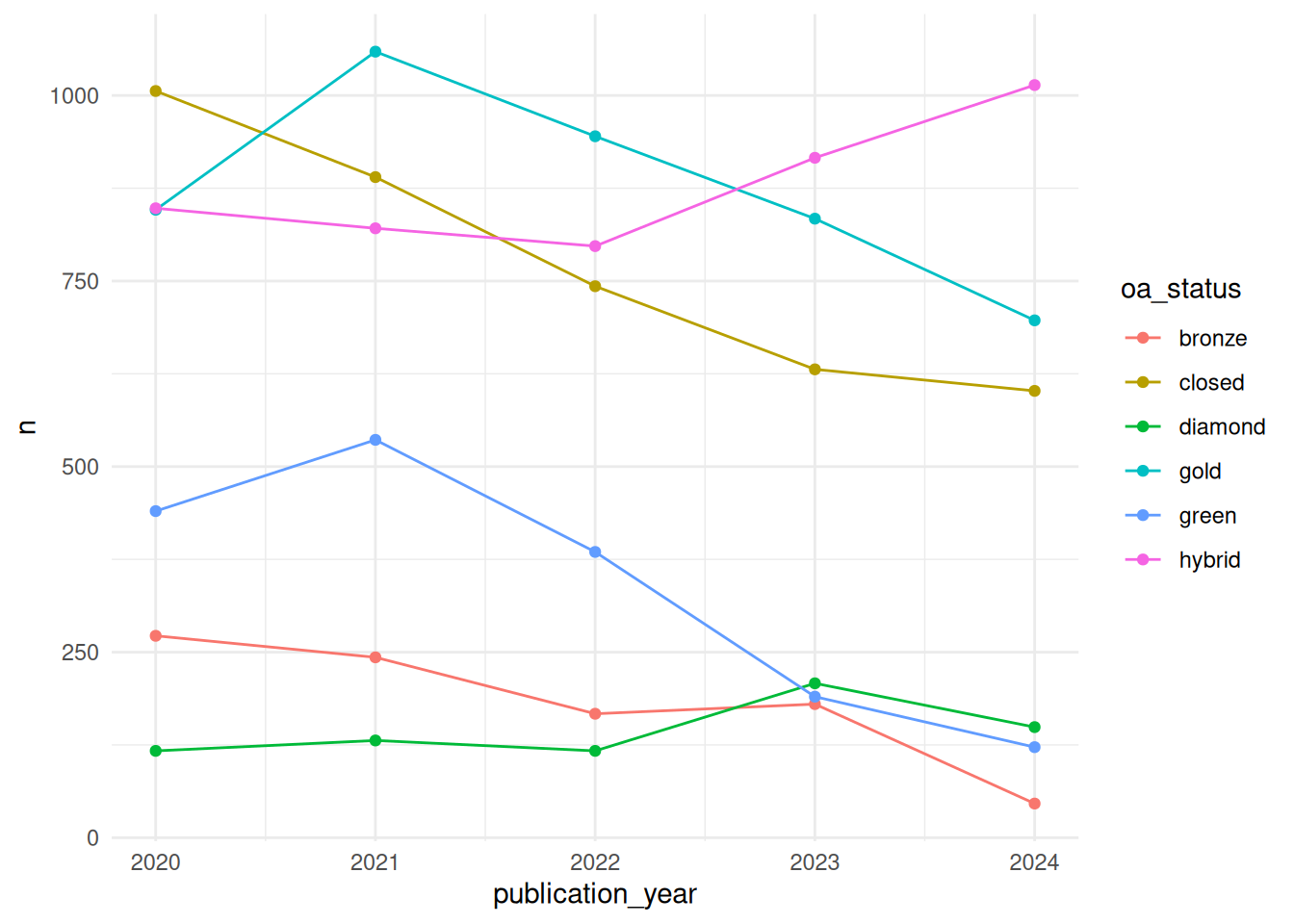 theme_minimal()The plot shows use the total number of publications for each publication year and open access status. Generally, there seems to be a downwards trend in terms of publication volume for all open access status types but hybrid open access.