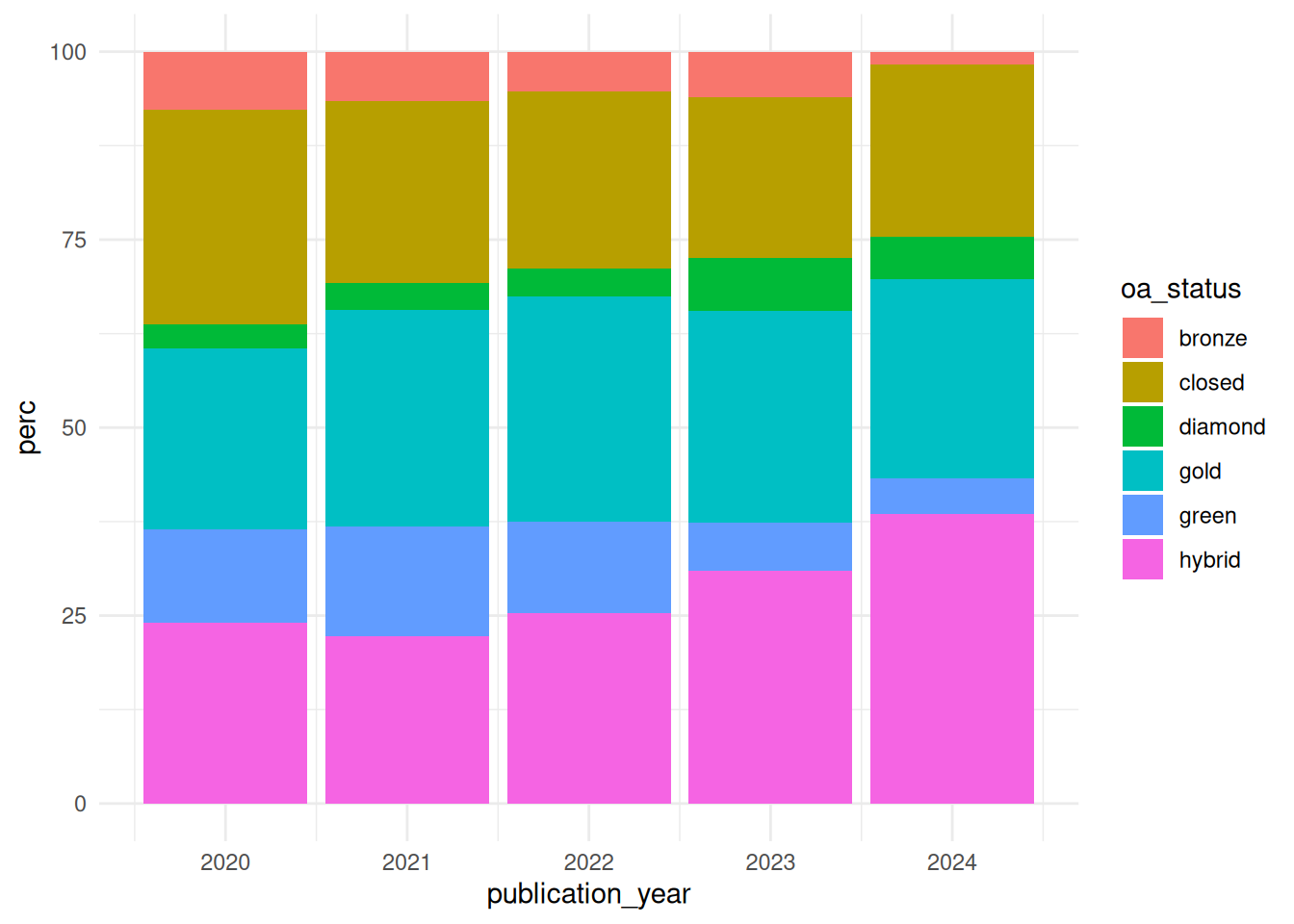The plot shows use the share of each open access status for each publication year. The most dominant open access types are gold and hybrid open access. Furthermore the share of open access publications across all publication years is higher than for closed access publications.