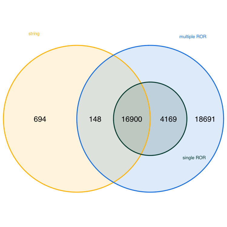The Venn diagram reveals that df2 (single ROR) is fully contained within df1 (multiple RORs). Furthermore, the diagram shows that 18,691 publications are unique to df1 — these are likely attributable to Charité – Universitätsmedizin Berlin, as they are not found in either the single-ROR or string-based searches. 694 publications are unique to df3 (string-based search), i.e. these are not captured by either ROR-based approach.