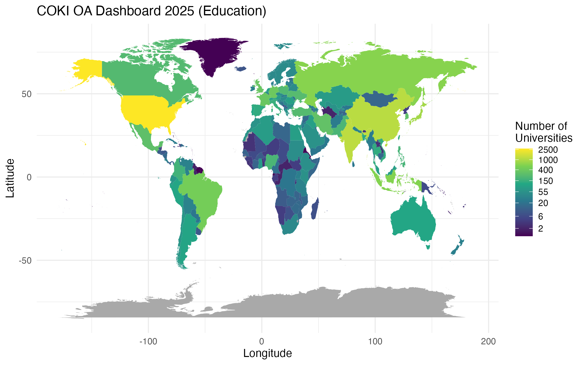 The version of the COKI Open Access Dashboard from August 18, 2025, includes data for 227 countries and 56,187 institutions worldwide (Curtin Open Knowledge Initiative, n.d.-c). The bibliographic data comes from multiple open data sources and covers the publication period 2000–2024, with Crossref being used primarily for publication identification (Curtin Open Knowledge Initiative, n.d.-c, n.d.-d). The selection of publication types is less restrictive compared to the other rankings, with only specific types such as datasets, databases, components, report components, peer reviews, funding acknowledgments, conference proceedings, journal issues, report series, book catalogs, and publications without a specified type being excluded (Curtin Open Knowledge Initiative, n.d.-c). Institutions must have at least 50 publications to be included in the COKI Open Access Dashboard, unless the institutions were already included in the dataset when it was based on the Microsoft Academic Graph dataset (Curtin Open Knowledge Initiative, n.d.-c).