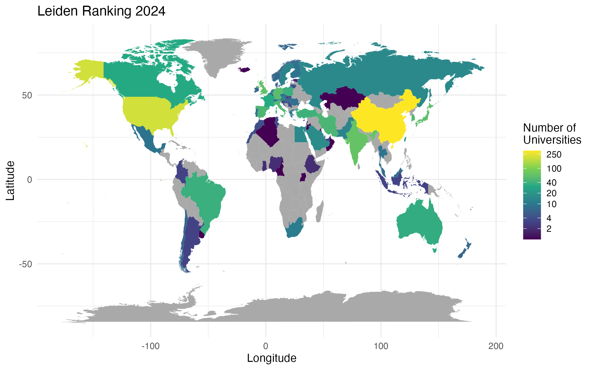The 2024 version of the Leiden Ranking includes bibliometric data for 1,506 universities worldwide (Centre for Science and Technology Studies, Leiden University, n.d.-a). Indicators are provided for four-year time periods, with the 2024 version extending this to the period 2019–2022 (Centre for Science and Technology Studies, Leiden University, n.d.-a). The bibliographic data comes from the Web of Science, but only articles and reviews published in international scientific journals are considered (Centre for Science and Technology Studies, Leiden University, n.d.-a). The selection of universities is based on their research performance, with a minimum of 800 so-called core publications required for inclusion in the ranking. Core publications are defined as publications in international scientific journals in fields suitable for citation analysis. These publications must be in English, have at least one author, not be retracted, and appear in a core journal. Core journals are characterized by their international orientation and must be situated in a field suitable for citation analysis. The Leiden Ranking does not use data directly from universities (Centre for Science and Technology Studies, Leiden University, n.d.-a, n.d.-c).