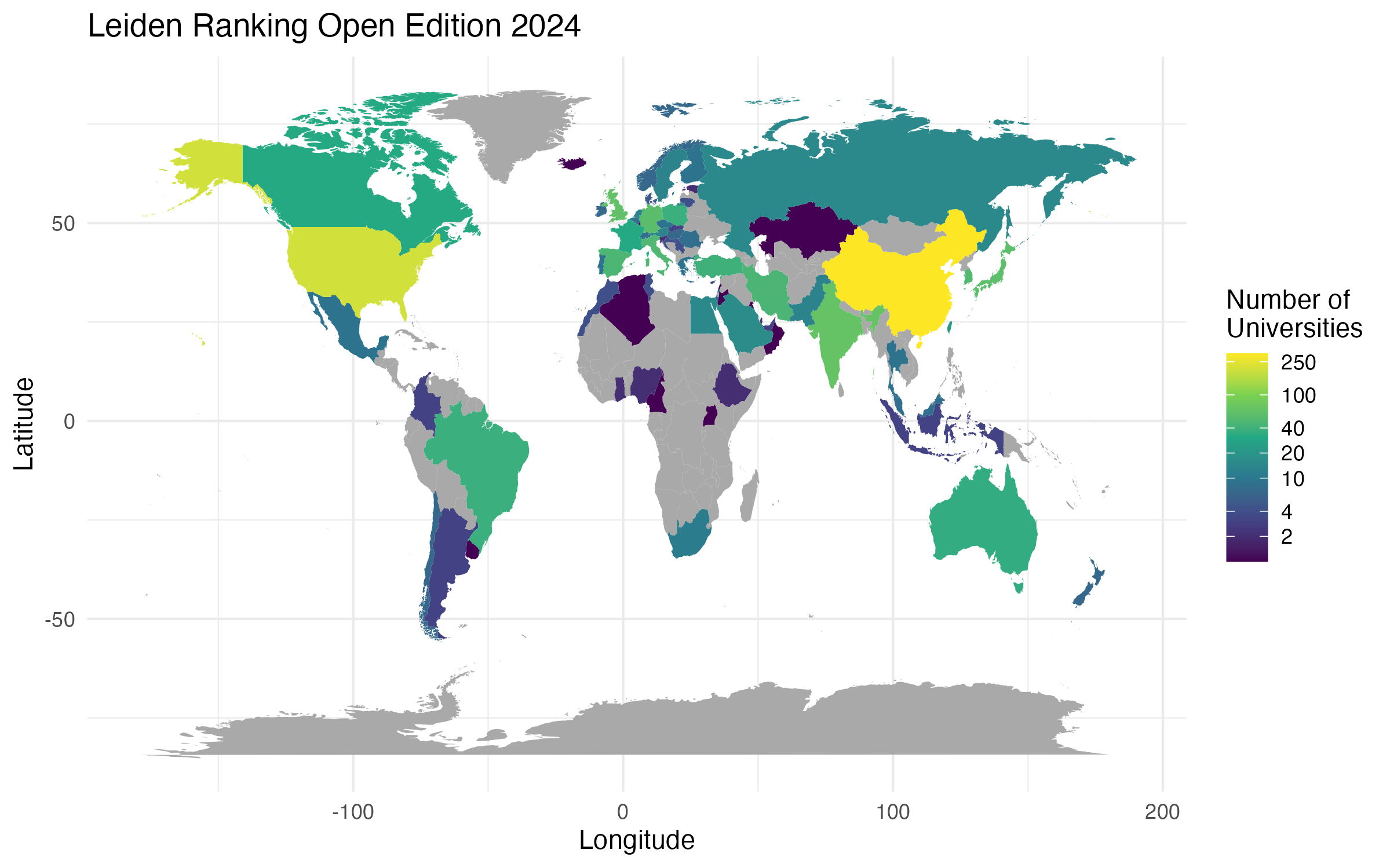 The 2024 version of the Leiden Ranking Open Edition includes bibliometric data for 1,506 universities worldwide (Centre for Science and Technology Studies, Leiden University, n.d.-b). Indicators are provided for four-year time periods, with the 2024 version extending this to the period 2019–2022 (Centre for Science and Technology Studies, Leiden University, n.d.-b). The bibliographic data comes from OpenAlex, but only so-called core publications are considered (Centre for Science and Technology Studies, Leiden University, n.d.-b). Compared to the traditional Leiden Ranking, the Open Edition also includes publications of the type “book chapters” published in book series as core publications. Furthermore, all publications must include author affiliations and references to be considered core publications. All other criteria for core publications and core journals are identical to those of the traditional Leiden Ranking (Centre for Science and Technology Studies, Leiden University, n.d.-b).
