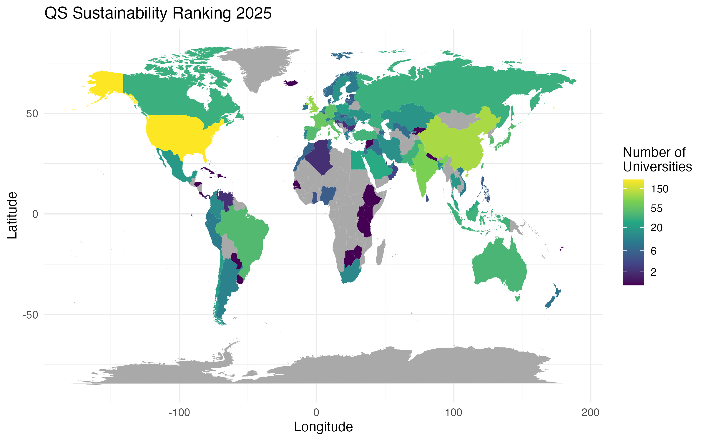 The 2025 version of the QS World University Rankings: Sustainability includes data for 1,744 universities worldwide (Quacquarelli Symonds, 2024). The bibliographic data comes from Scopus and covers a five-year period (Quacquarelli Symonds, n.d.-c). Only the publication types articles, reviews, conference contributions, books, book chapters, articles in press, and business articles are considered (Quacquarelli Symonds, n.d.-d, n.d.-e). Institutions are included in the QS World University Rankings: Sustainability only if they meet eligibility criteria for inclusion in at least one of the rankings QS World University Rankings, QS Rankings by Region, or QS Rankings by Subject and also achieve a non-zero score for specific indicators within the Environmental Impact and Social Impact dimensions (Quacquarelli Symonds, n.d.-f).