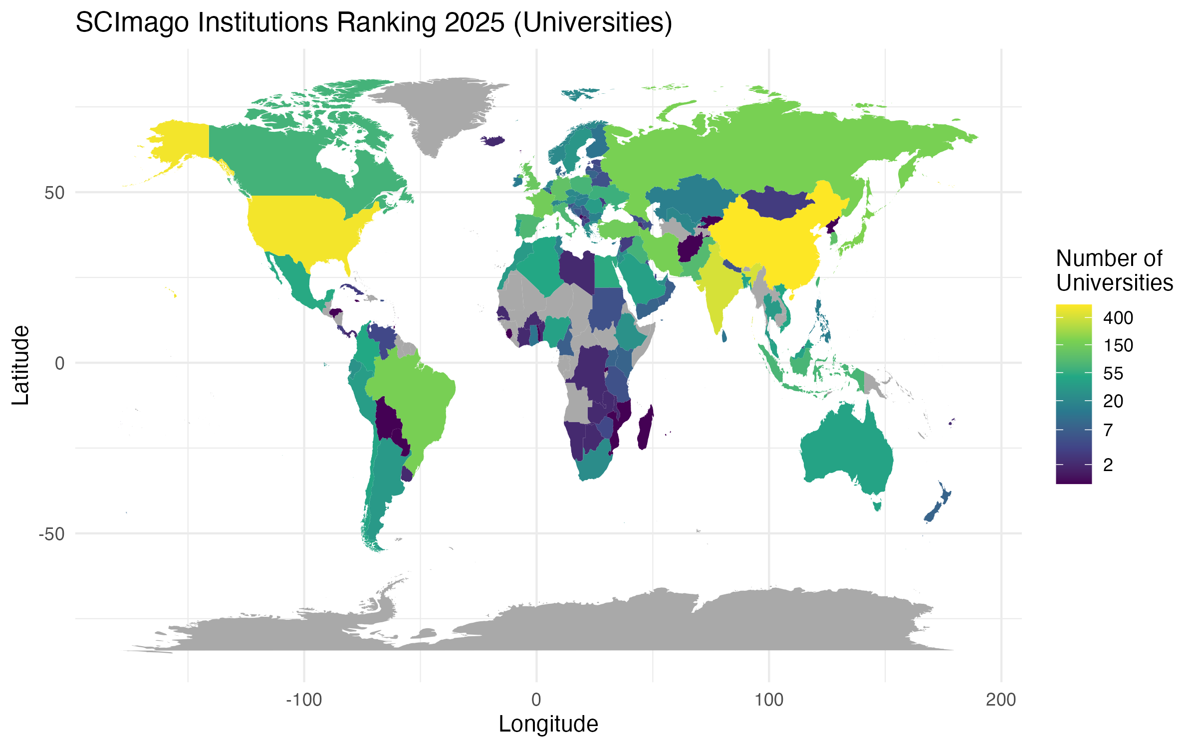 The 2025 version of the SCImago Institutions Ranking includes data for 9,756 institutions worldwide (SCImago Research Group, n.d.-b). The composite indicator is provided annually for a five-year period ending two years before the ranking’s publication, meaning for the 2025 version, the period is 2019–2023. The bibliographic data comes from Scopus. The selection of institutions is based on their publication performance. In the last year of the period considered, institutions must have published at least 100 Scopus-indexed publications to be included in the ranking. Furthermore, at least 75% of an institution’s total publication volume must consist of citable documents. For the SCImago Institutions Ranking, citable documents include the publication types articles, book chapters, conference contributions, reviews, and short surveys (SCImago Research Group, n.d.-a).