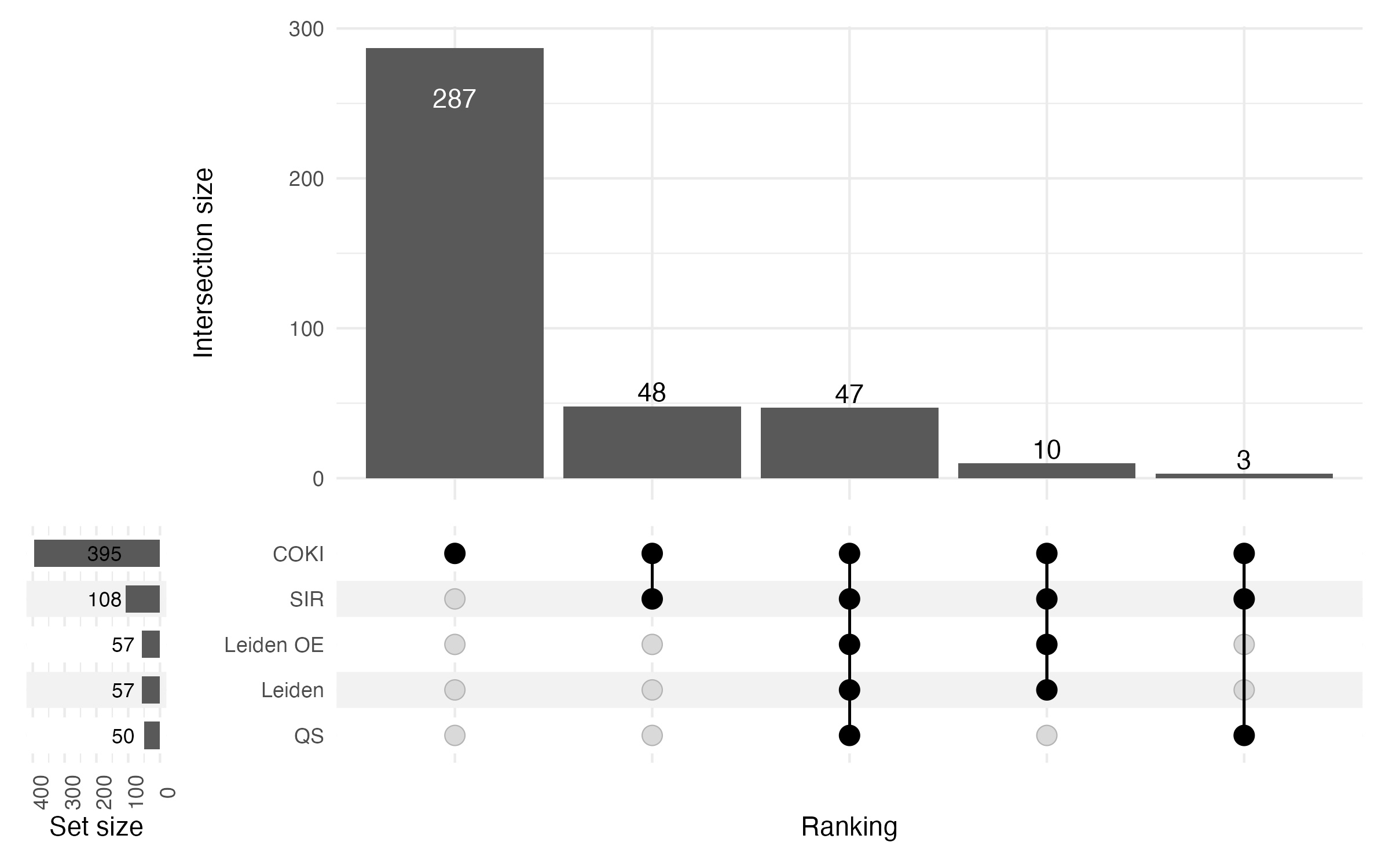 While the QS Sustainability Ranking and both versions of the Leiden Ranking only include universities in their rankings, the COKI OA Dashboard and the SCImago Institutions Ranking also include institutions from other sectors. Universities in the COKI dataset are classified with the institution type Education, while in the SCImago Institutions Ranking dataset, the sector Universities is assigned to universities. To further investigate the institutional overlaps of German universities between the five ranking systems, a sector column was added to the merged dataset of all ranking systems. For institutions represented in both versions of the Leiden Ranking or in the QS Sustainability Ranking, the sector classification Universities was added. For institutions represented in the SCImago Institutions Ranking or the COKI OA Dashboard, the original classification was retained. The dataset was then filtered to include only institutions assigned to the Universities or Education sectors.