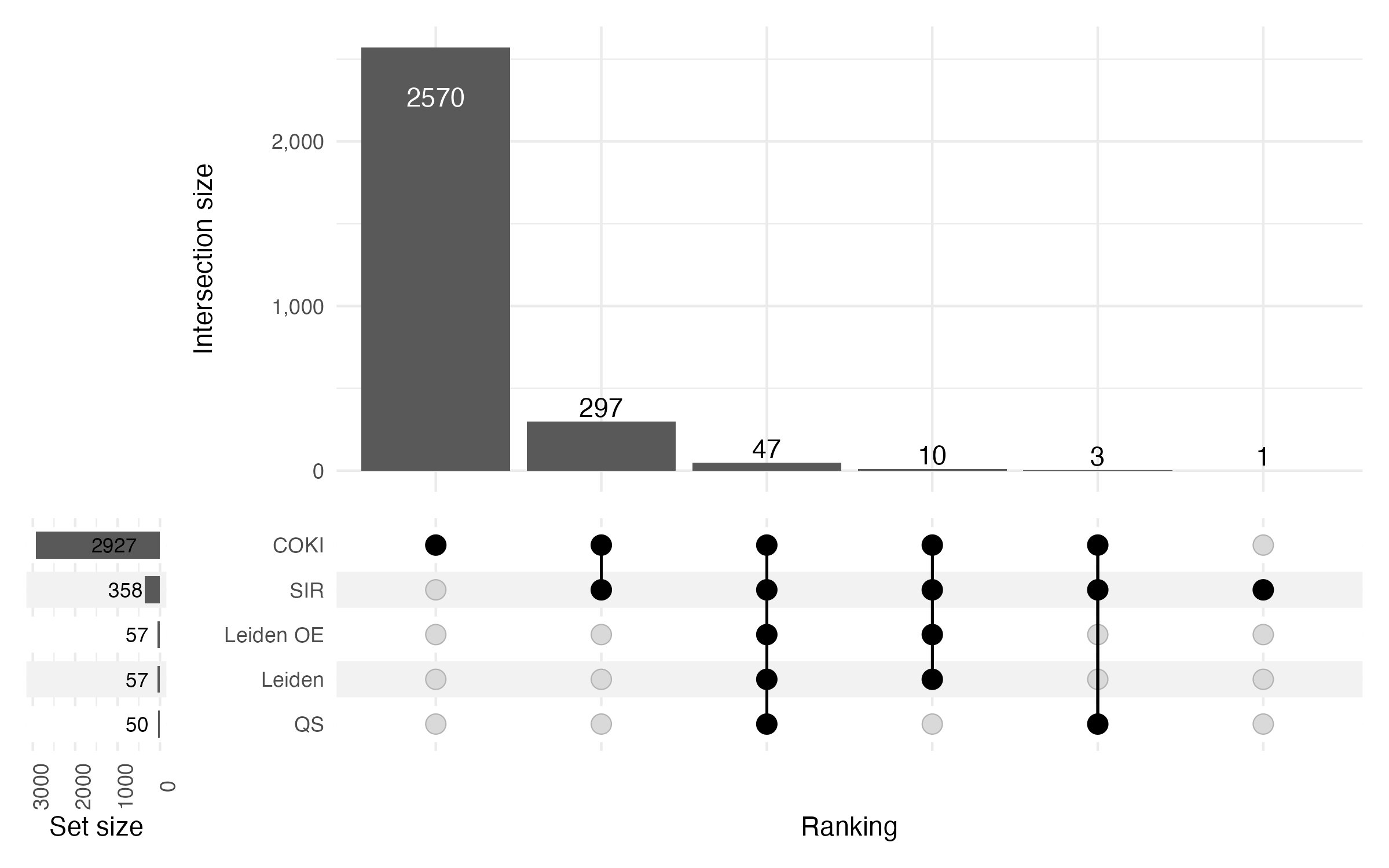 Während das QS Sustainability Ranking sowie beide Versionen des Leiden Ranking lediglich Hochschulen in ihre Rankings einbeziehen, sind im COKI OA Dashboard und dem SCImago Institutions Ranking auch Institutionen aus anderen Sektoren erfasst. Hochschulen werden im COKI-Datensatz mit dem Institutionentyp Education klassifiziert, während im Datensatz des SCImago Institutions Ranking der Sektor Universities für Hochschulen zugewiesen ist. Um folgend die institutionellen Überschneidungen der deutschen Hochschulen zwischen den fünf Rankingsystemen zu untersuchen, wurde im zusammengeführten Datensatz aller Rankingsysteme eine Spalte sector hinzugefügt. Für Einrichtungen, die in beiden Versionen des Leiden Ranking oder im QS Sustainability Ranking abgebildet sind, wurde die Sektorzuordnung Universities ergänzt. Für Einrichtungen, die im SCImago Institutions Ranking oder COKI OA Dashboard abgebildet sind wurde die ursprüngliche Klassifikation beibehalten. Anschließend wurde der Datensatz nach Einrichtungen gefiltert, denen in der sector-Spalte die Werte Universities oder Education zugewiesen waren.