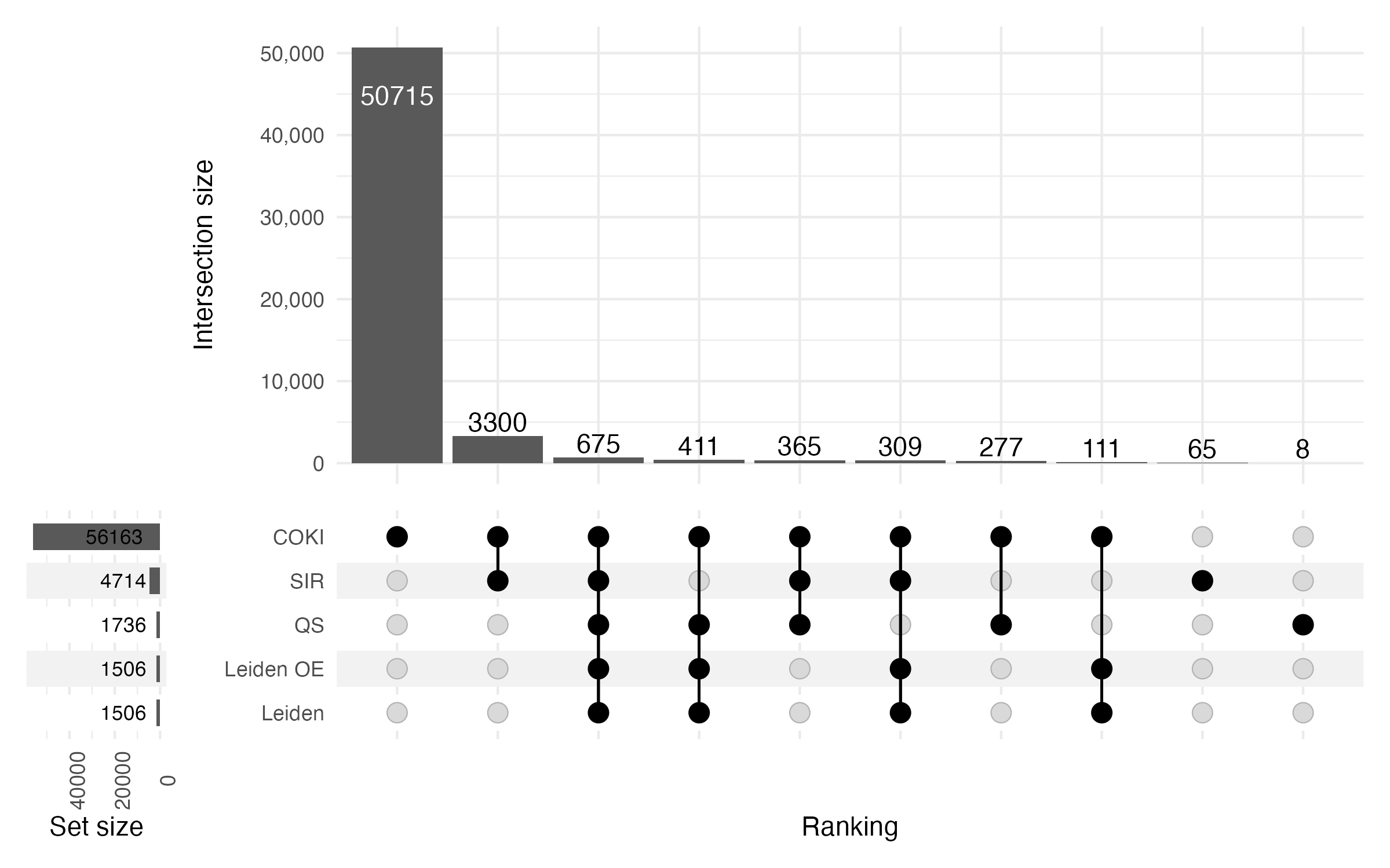Insgesamt konnten nach dem Abgleich der ROR IDs 56.236 einzigartige Instiutionen über alle Rankingsysteme hinweg identifiziert werden. Anhand von Abb. 1 ist zu erkennen, dass das COKI OA Dashboard deutlich mehr Institutionen abbildet, als alle anderen Rankingsysteme, sowohl insgesamt (56.163 Institutionen, 99,87 %), als auch in Bezug auf die Anzahl an Institutionen, die in keinem anderen Rankingsystem abgebildet werden (50.715 Institutionen, 90,18 %). Dies könnte insbesondere darauf zurückzuführen sein, dass das COKI OA Dashboard zum einen relativ langen Publikationszeitraum abbildet (2000–2024) und zum anderen auch Institutionen aus mehreren Sektoren, sowie Institutionen mit einem relativ geringen Publikationsvolumen von i.d.R. mindestens 50 Publikationen in das Ranking aufnimmt (Curtin Open Knowledge Initiative, n.d.-b, n.d.-a).