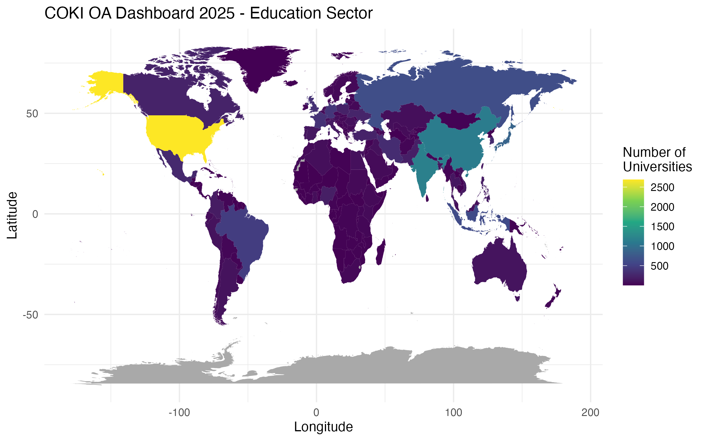 Die Version vom 18.08.2025 des COKI Open Access Dashboard umfasst Daten für 227 Länder und 56.187 Institutionen weltweit (Curtin Open Knowledge Initiative, n.d.-b). Die bibliographischen Daten stammen aus mehreren offenen Datenquellen und berücksichtigen den Publikationszeitraum 2000–2024, zur Identifikation von Publikationen wird insbesondere Crossref genutzt (Curtin Open Knowledge Initiative, n.d.-b, n.d.-c). Die Auswahl der Publikationstypen ist im Vergleich zu den anderen Rankings weniger restriktiv, ausgeschlossen werden lediglich Publikationen mit den Typen Datensätze, Datenbanken, Komponenten, Berichtskomponenten, Peer Reviews, Fördermittel, Tagungsbände, Zeitschriftenausgaben, Berichtsreihen, Buchverzeichnisse, sowie alle Publikationen ohne angegebenen Publikationstyp (Curtin Open Knowledge Initiative, n.d.-b). Institutionen müssen mindestens 50 Publikationen aufweisen, um in das COKI Open Access Dashboard aufgenommen zu werden, es sei denn, die Institutionen waren bereits im Datensatz aufgenommen, als dieser noch auf Microsoft Academic Graph basierte (Curtin Open Knowledge Initiative, n.d.-b).