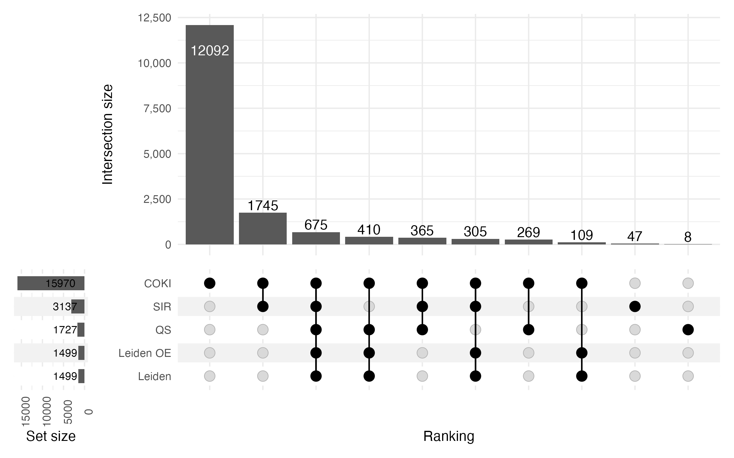Insgesamt konnten 16.025 einzigartige Institutionen aus dem gesamten Datensatz identifiziert werden, die dem Bildungssektor zugeordnet sind. Abb. 2 zeigt, dass das COKI OA Dashboard auch in Bezug auf die Bildungsinstitutionen deutlich mehr Institutionen abbildet, als alle anderen Rankingsysteme, sowohl insgesamt (15.970 Institutionen, 99,66 %), als auch in Bezug auf die Anzahl an Institutionen, die in keinem anderen Rankingsystem erfasst sind (12.092 Institutionen, 75,46 %). Die Anzahl an Institutionen, die in allen fünf Rankingsystemen erfasst sind ist unverändert (675 Institutionen, 1,2 %).