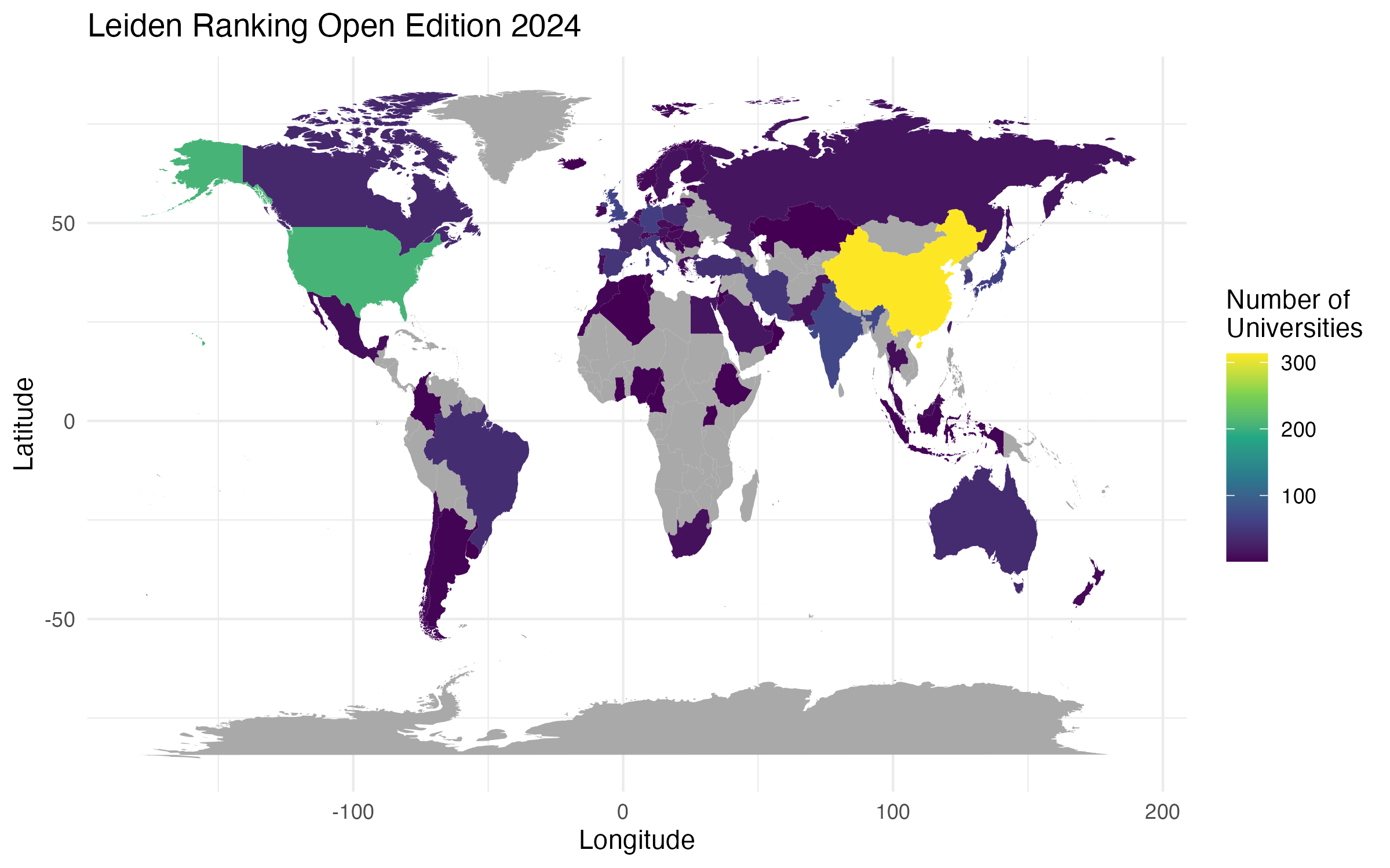 Die Version 2024 des Leiden Ranking umfasst bibliometrische Daten für 1.506 Hochschulen weltweit (Centre for Science and Technology Studies, Leiden University, 2025f). Indikatoren werden jeweils für Zeiträume von vier Jahren angegeben, die Version 2024 erweitert diese um den Zeitraum 2019–2024 (Centre for Science and Technology Studies, Leiden University, 2025c). Die bibliographischen Daten stammen aus OpenAlex, wobei jedoch nur sogenannte core publications berücksichtigt werden (Centre for Science and Technology Studies, Leiden University, 2025c). Im Vergleich zum traditionellen Leiden Ranking zählen in der Open Edition zusätzlich Publikationen vom Typ Buchkapitel, die in Buchreihen veröffentlicht wurden zu den core publications. Ferner müssen alle Publikationen nicht nur Autor:innenangaben, sondern auch Affiliationsangaben und Referenzen enthalten, um zu den core publications zu zählen. Alle anderen Kriterien für die core publications und core journals sind deckungsgleich zum traditionellen Leiden Ranking (Centre for Science and Technology Studies, Leiden University, 2025c).