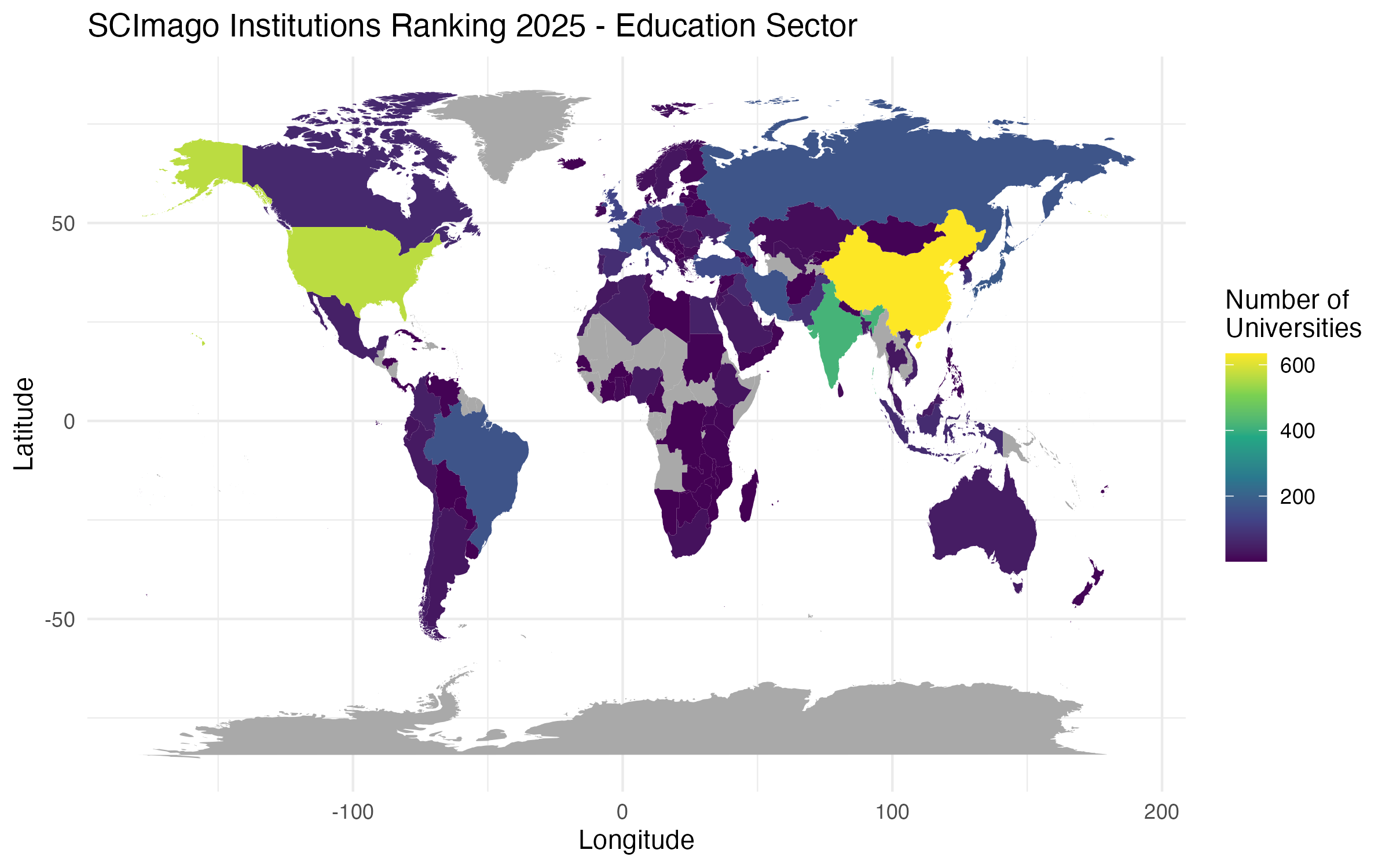Die bereitgestellten Daten zeigen eine Abweichung um eine Institution zu der von SCImago auf der Rankingwebsite berichteten Anzahl an gerankten Institutionen (SCImago Research Group, n.d.-b). Die bereitgestellte csv-Datei enthält zwar 9.756 Zeilen, jedoch handelt es sich bei der ersten Zeile lediglich um eine Kopfzeile.↩︎